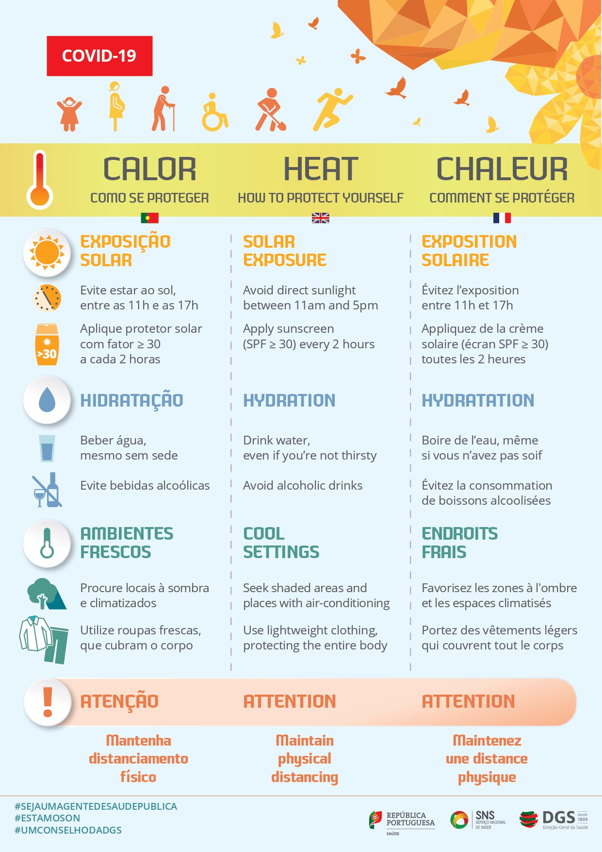 Considerando as temperaturas elevadas que se têm feito sentir, a previsão da manutenção destas condições para os próximos dias e o risco no impacto em saúde existente, a Direção-Geral de Saúde dispõe um conjunto de medidas preventivas para se proteger dos efeitos do calor intenso na saúde mantenha-se informado, hidratado e fresco.